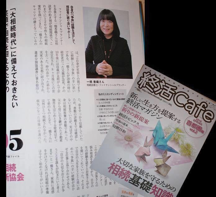 終活Cafeに載りました! 2016年9月3日 メディア掲載情報良き人生の為の終活マガジン『葬祭流儀』から生まれた『終活Cafe』は終活に関連した様々な情報を 発信している雑誌ですがその首都圏版vol.2にインタビューが載りました。 相続診断士として笑顔相続に賭ける私の想いを見開き1ページに取り上げていただきました。