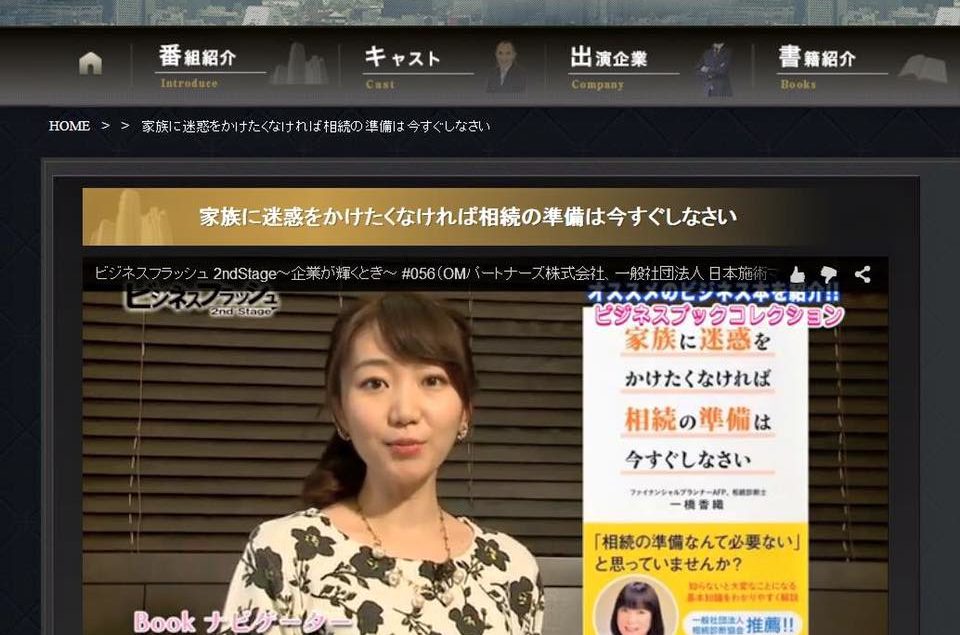 千葉テレビ『ビジネスフラッシュ』 で著書が紹介されました 2016年9月7日 メディア掲載情報2016年3月5日10時半より放送されている千葉テレビ『ビジネスフラッシュ』内の 書籍紹介コーナーで私の著書が紹介されました。 短い時間ですが下記サイトから見ていただけますのでお時間あるときにでもご覧下さい。http://business-flash.com/books/%e5%ae%b6%e6%97%8f%e3%81%ab%e8%bf%b7%e6%83%91%e3%82%92%e3%81%8b%e3%81%91%e3%81%9f%e3%81%8f%e3%81%aa%e3%81%91%e3%82%8c%e3%81%b0%e7%9b%b8%e7%b6%9a%e3%81%ae%e6%ba%96%e5%82%99%e3%81%af%e4%bb%8a%e3%81%99/